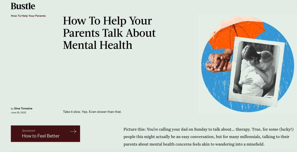How To Help Your Parents Talk About Mental Health ginatomaineMay 7, 2023Uncategorized Post navigation PreviousNext Read the full story in Bustle. Related